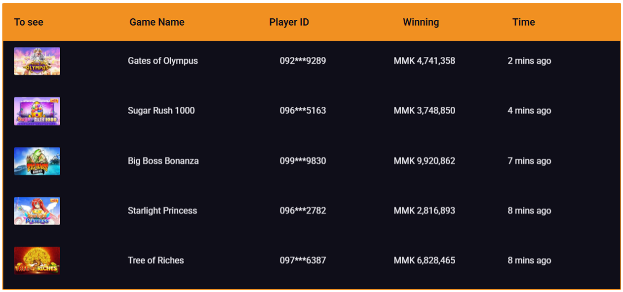 “ကျွန်တော့်သူငယ်ချင်းက ၁၃ သိန်း ၂ သောင်း ၄ ထောင် (၁,၃၂၄,၀၀၀) နိုင်ပြီး ကျွန်တော့်ကို အကြံပေးလို့ ၂၀၂၂ ခုနှစ် ကတည်းက Pragmatic Play စလော့ဂိမ်းတွေ ကစားလာတာပါ။ သူ ‘Buffalo King’ ကစားနေတုန်း Bonus သင်္ကေတ ငါးခုရပြီး Free Spins ၂၅ ခု နိုင်သွားတာ တကယ်ကို အနိုင်ရတဲ့ အခိုက်အတန့်ပါပဲ! ကျွန်တော်လည်း တစ်ပတ်ကို ၁,၀၀၀ နဲ့ ကစားတယ်။ အနိုင်ရတာလည်း မကြာခဏဆိုတော့ မဆိုးပါဘူးဗျာ!”